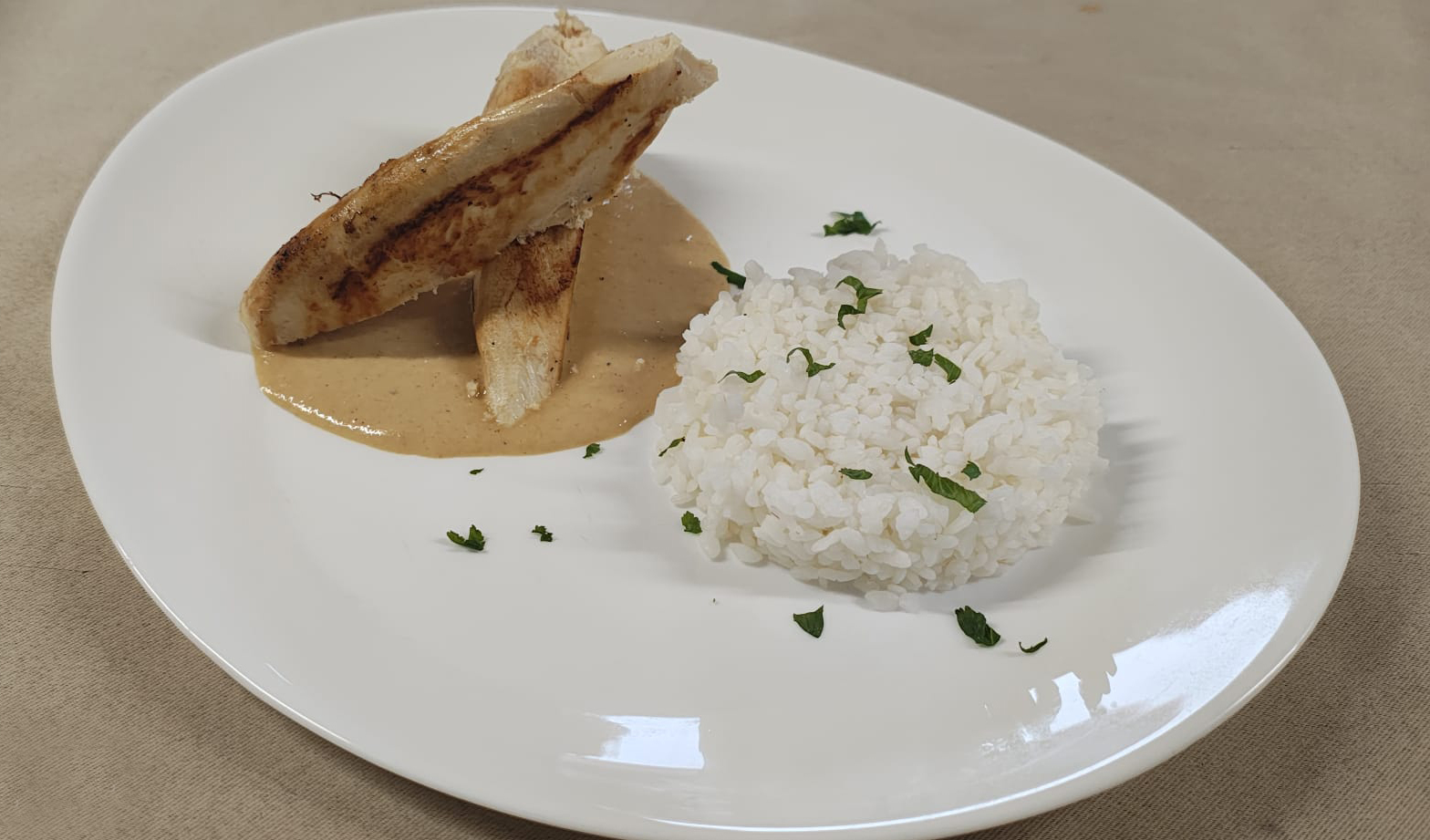 Piept de pui 200gr, orez 200gr, sos curry 100gr.